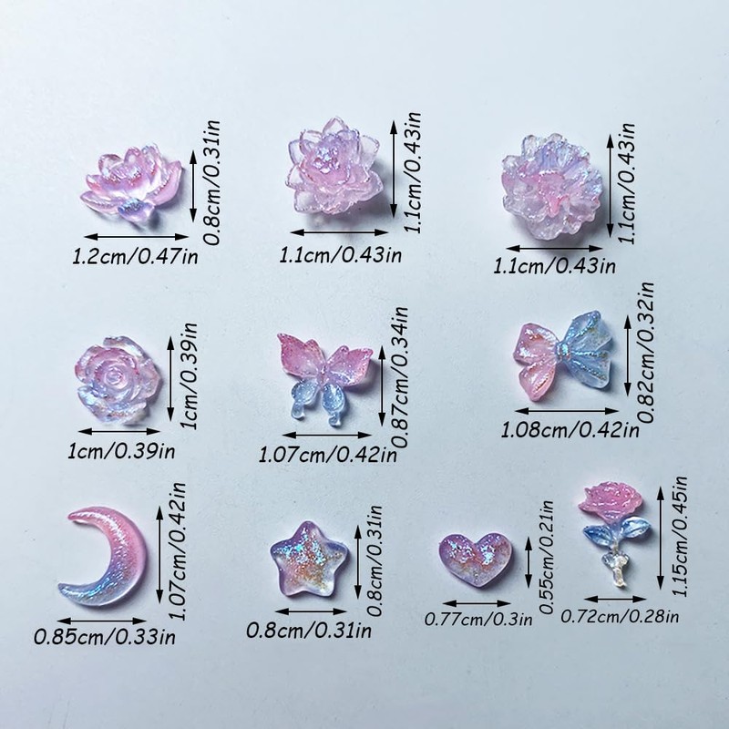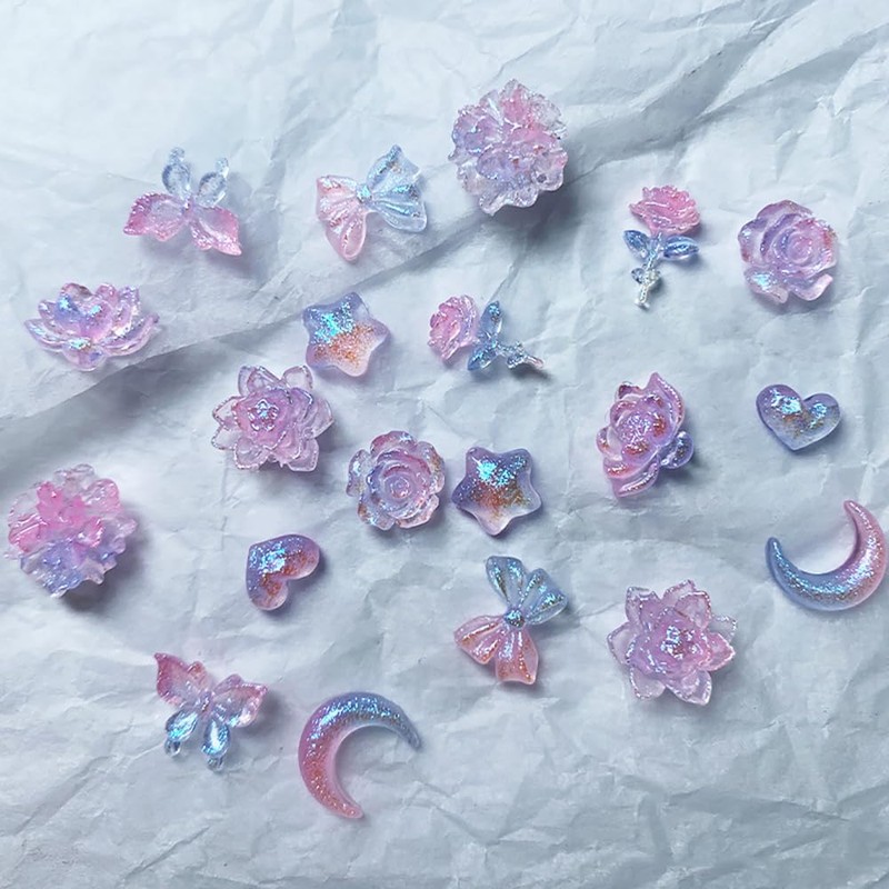 - 3D mixed shapes nail charms: the nail set can include flower pendant, heart pendant, bow pendant, butterfly pendant, moon pendant, star pendant, lotus pendant, camellia pendant, rose pendant and peony pendant