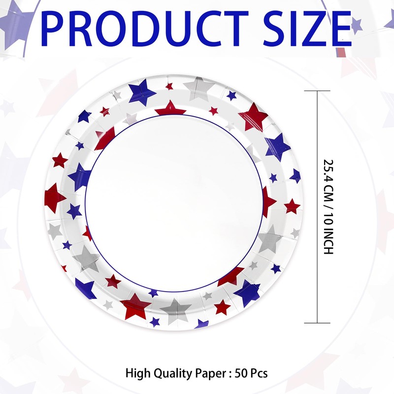 - 【Large Capacity Set】 Package contains 50 Pcs 4th of July disposable round paper plates, plenty enough to meet your family use and party needs. The enlarged capacity size is about 10"/25.4 cm, which can hold more food and provide plenty of space for your delicious treats. They are perfect for serving cakes, snacks and other types of hearty dinners