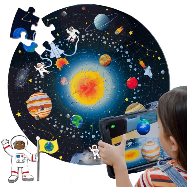 50pcs Solar System Puzzle. Smart technology uses augmented reality to bring Space to life. Learn facts about space! Solar System design 60cm Diameter. Large pieces ages 3+ requires compatible device