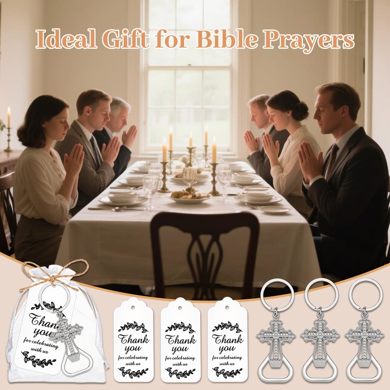 • Christians Party Favor: Our Cross Keychain Bottle Opener Set includes 50pcs uniquely designed bottle openers, 50pcs writable thank you tags, 50pcs white organza bags and a bundle of jute twine, making it the perfect gift for party guests