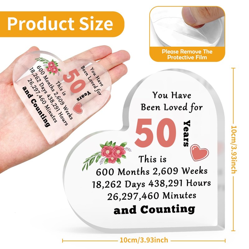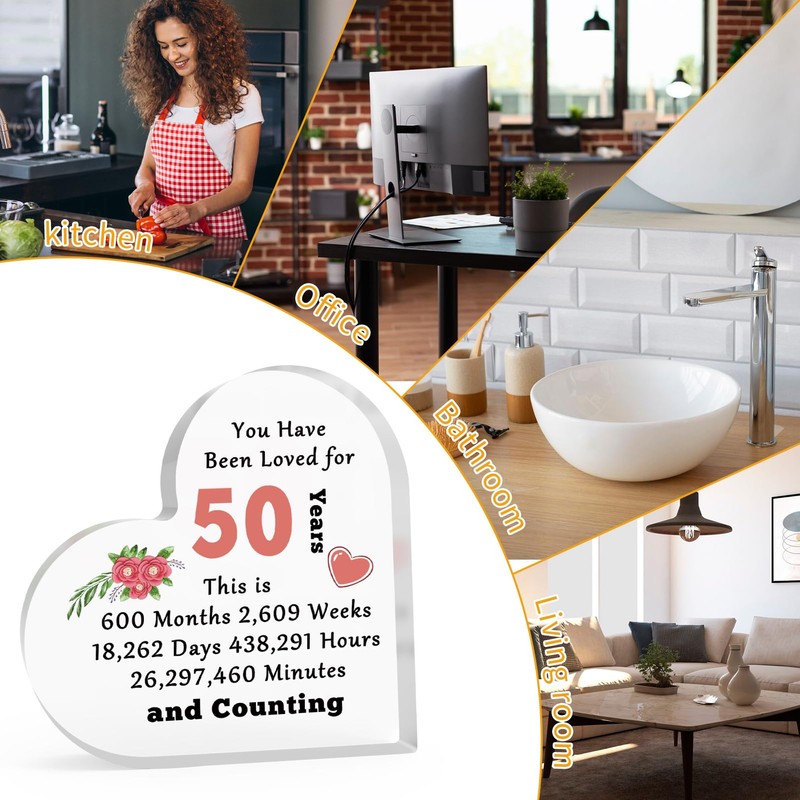 - 50th Anniversary for Her: This 50 Anniversary sign is printed with "You have been loved for 50 years this is 600 months 2,609 weeks 18,262 days 438,291 hours 26,297,460 minutes and counting". Simple and Exquisite, perfect gift to celebrate your 50th anniversary, perfect for that special person you are sharing your life with.