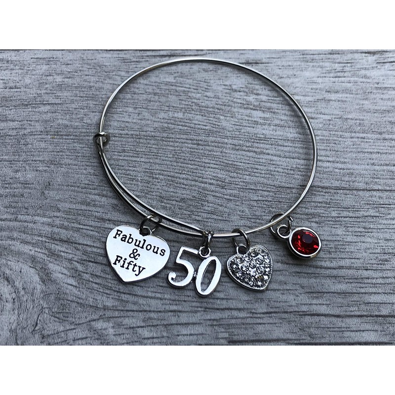 50th Birthday Bangle Bracelet with Birthstone Charm, 50th Birthday Gifts for Women, Fabulous and Fifty Bracelet. 50th Bday Gifts for Her