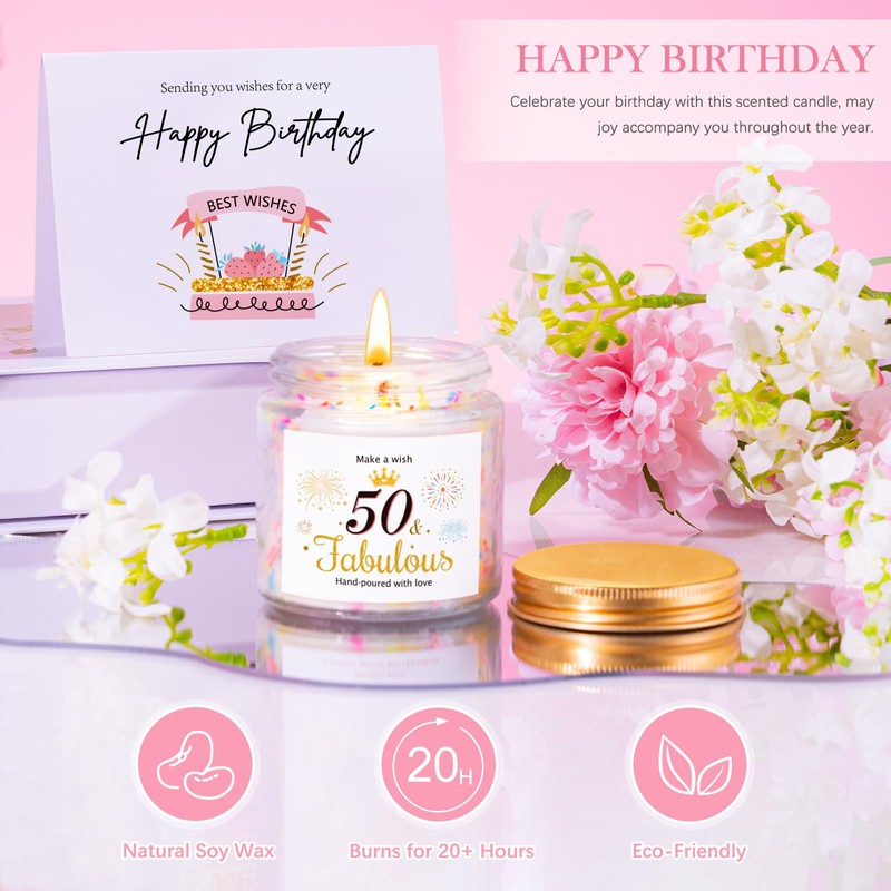 - 5 CAREFULLY SELECTED 50TH BIRTHDAY ACCESSORIES: Our luxury 50th birthday gift box includes: 1 × 16oz drinking cup with lid, straw & cleaning brush (printed with "IN MY FIFTIES ERA"), 1 × rose bath bomb, 1 × 3.53oz bluebell-scented candle ("50 & fabulous"), 1 × oatmeal milk soap ("50 is the new awesome"), 1 × elegant happy birthday card. All elegantly packed in a purple-themed Happy Birthday box.