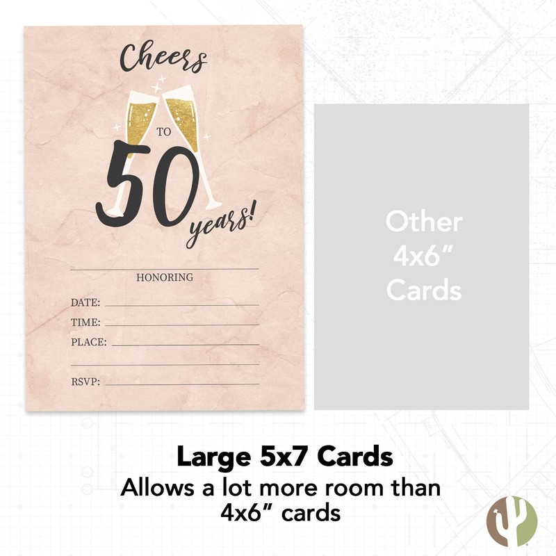- 232 x 7 - Don’t be fooled by small invitation sizes. Our invitations measure 5 inches wide x 7 inches tall. Printed on a premium 14 point cardstock, these invitations are uncoated, so it’s easy for you to write on them. All invitations feature a design on both sides.