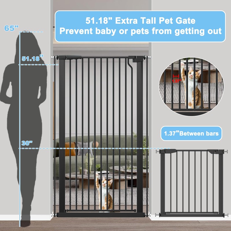 - Extra Tall and Narrow Design: Our pet gate has a height of 51.18 inches and a pole clearance of only 1.37 inches to prevent pets from escaping
