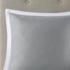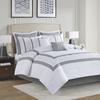 510 Design presents the Powell 8 Piece Embroidered Comforter Set to elevate your bedroom decor. This hotel style white comforter features an embroidered and pieced border for a sophisticated and elegant design that easily coordinates with your space. The matching pillow shams also flaunt beautiful embroidery details, while the grey Euro shams are accented with graceful white flanges to complete the transitional look. A solid grey bedskirt and 2 decorative pillows with embroidered details add the finishing touches to this hotel style bedding set. Hypoallergenic polyester filling in the comforter and pillows contains no allergens and is treated to be dustproof. Machine washable for easy care, this embroidered comforter set may come in rolled or compressed packing and will need to be fluffed up. Use a steam iron to help remove wrinkles easier.