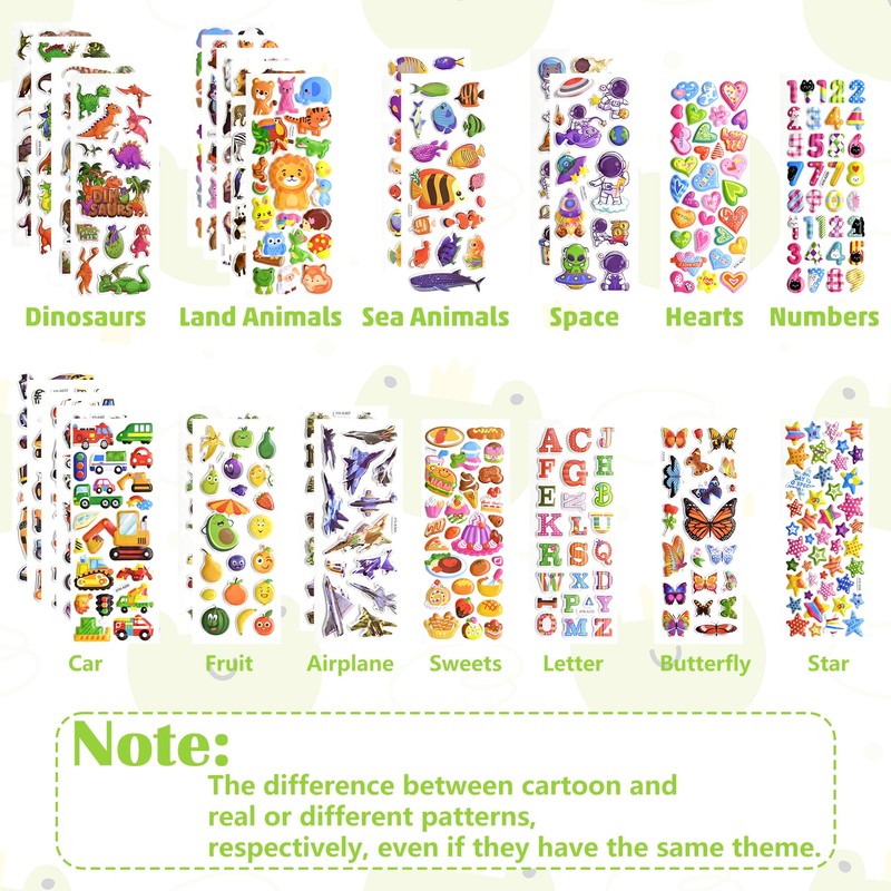 • 511 Puffy Stickers with 28 Sheets: This sticker pack includes 28 colorful sheets featuring 511 unique puffy stickers. With playful themes like dinosaurs, animals, cars, fruits, numbers, letters and more, it delivers endless fun for boys and girls. Perfect for sticker books, creative crafts, preschool projects, and group activities.