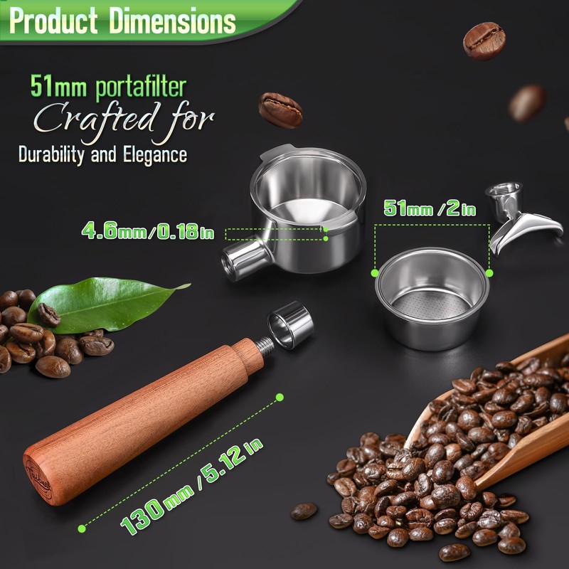 51mm Dual Ear Portafilter for DeLonghi EC200/EC221/EC330 Series - Stainless Steel Handle with Precision Basket and Siam Rosewood Grip