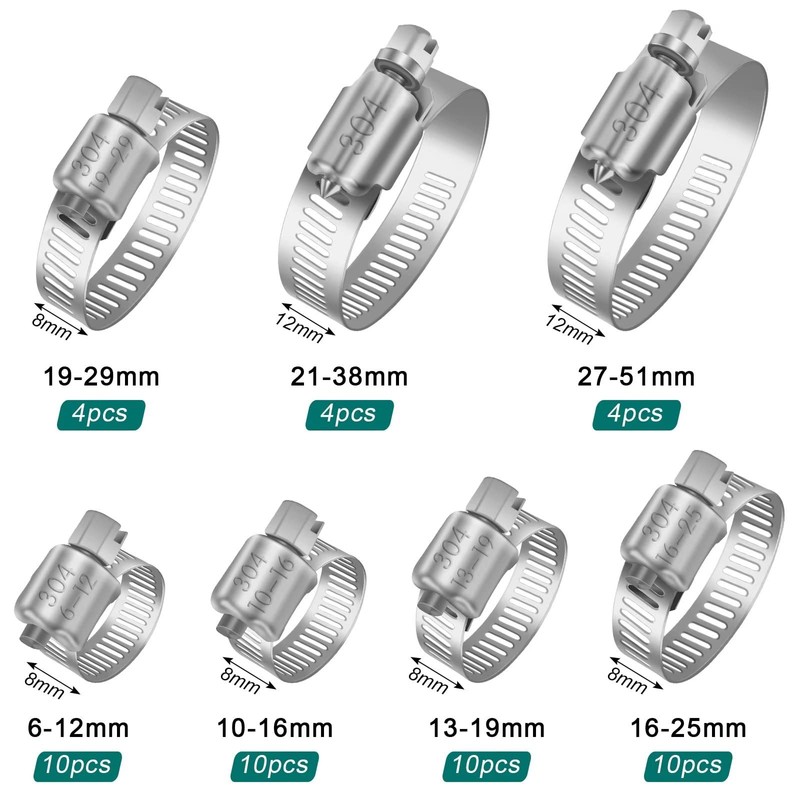 - Stainless steel hose clamps specifications: the hose clamp set is flexible and ductile with a wide adjustable size range from 6 to 51 mm. Contains 7 different sizes: 10 pieces 6-12 mm, 10 pieces 10-16 mm, 10 pieces 13-19 mm, 10 pieces 16-25 mm, 4 pieces 19-29 mm, 4 pieces 21-38 mm, 4 pieces 27-51 mm, clamps for a total of 52 pieces, enough for replacement and daily replacement life.