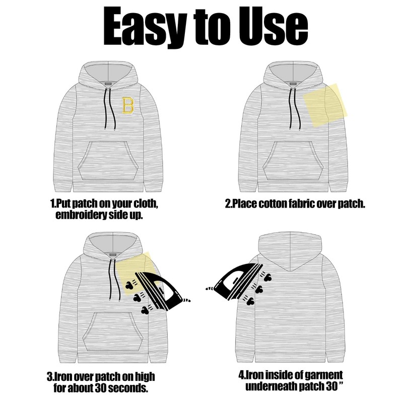 1.Put the letter decal patch where you want to paste it. The side with the hot glue is attached to the clothes (the glue cannot be torn off) and the top layer is covered with cloth to prevent the clothes from being damaged. To preheat an iron, simply press the iron from the top of the cloth for 10 to 20 seconds to hold it in place. It is also possible to hold the cloth in place with a needle before ironing to prevent it from migrating.