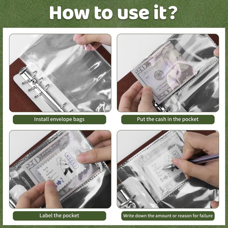 • 🎀【INCLUDED ITEMS】- 1 leather envelope challenge binder, 25 six-hole cash envelopes (with 6 pockets per page), pink completion labels for weeks 1 to 52, and green incomplete labels.
