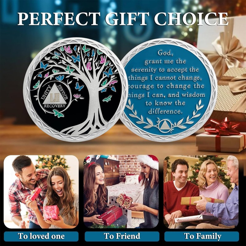 • 💕Double-Sided Design: The front of aa coin showcases a robust Tree of Life encircled by pink, green, and blue enamel butterflies, along with the "UNITY, SERVICE, RECOVERY" Three Legacies Motto and a laser-engraved sobriety length. The back side of 1 year aa coin features the Serenity Prayer, offering a poignant reminder to face life's challenges with equanimity.