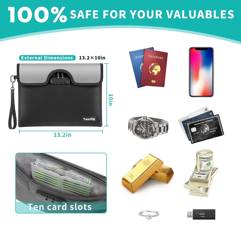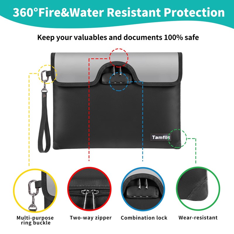 - Tamfile document bag with lock can provide you with property protection and privacy protection. You can safely hand valuables such as cash, certificates, passport, bank cards, etc. to our document protection bag; when you travel outdoors, you can buckle it on the backpack through the ring buckle, and the 8-layer fireproof material is very strong, no matter how sharp the blade is It cannot be easily cut apart, so that you are no longer afraid of thieves when traveling outdoors.