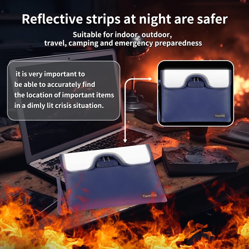 - Tamfile Professional Fireproof Document Bag: 8-layer fireproof heat insulation flame retardant material money bag with lock, meets fire safety standards, can withstand temperatures up to 5200℉, has passed the UL 94 VTM-0 test for fire resistance. Cash fireproof money bag is made of flame retardant Thread and fireproof hemming sewn to prevent fire from damaging the fireproof bag from the edges, Velcro flap closure makes its zipper completely fireproof, making the money pouch 360° fireproof.