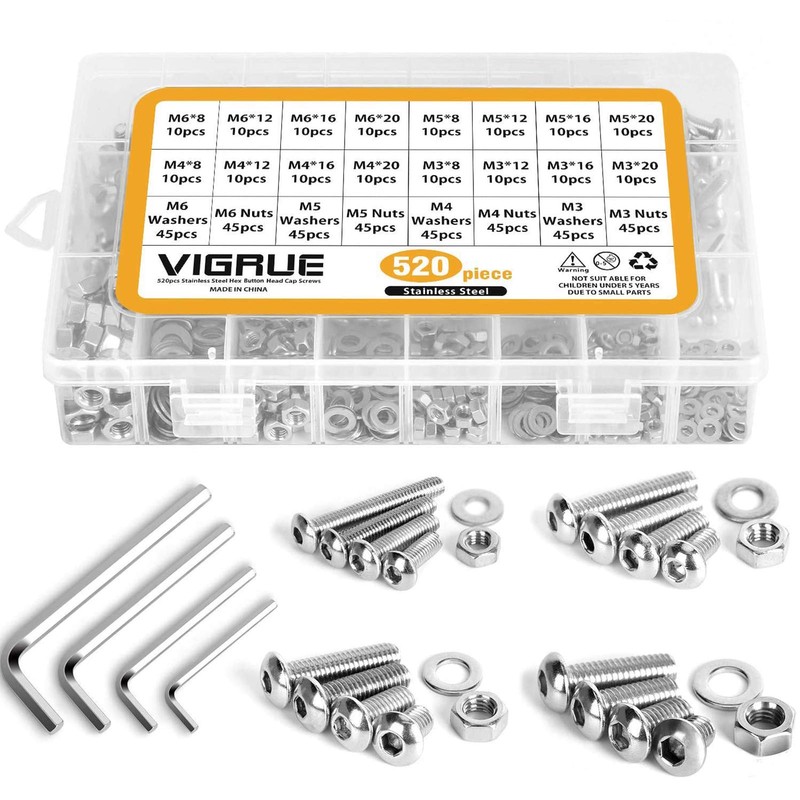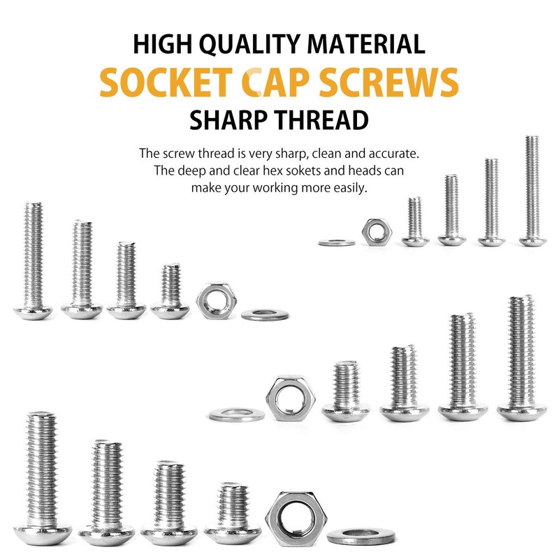 - √ Many various sizes of M3 M4 M5 M6 screws (Drive Type: Hex Socket; Head Style: Button Head) with matching nuts and flat washers meet different people’s demands, the necessity of your home life.
