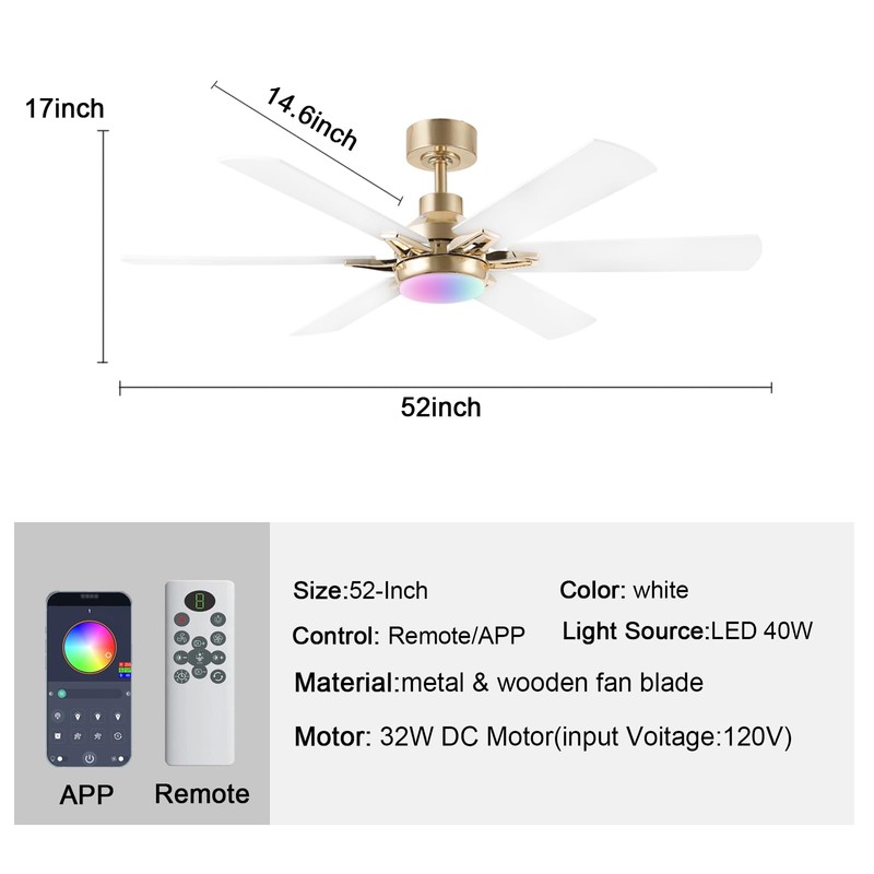 52in Ceiling Fans with Lights RGB Ceiling Fan with Light and Remote/APP Contr...