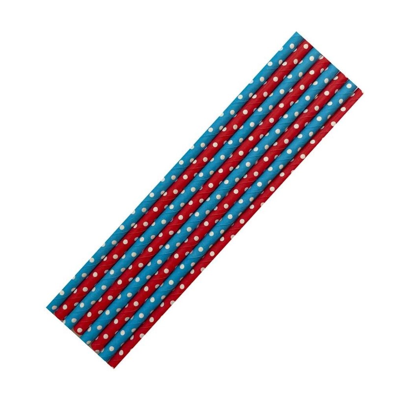 - The set is complemented by 8 matching paper straws in blue and red with white dots from spielum