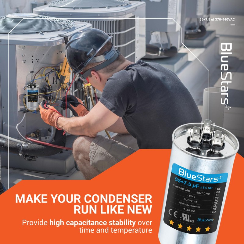 - 🔎 PRODUCT NAME: 55+7.5 uf MFD ±5% 370 or 440 Volt AC CBB65B Dual Run Round Capacitor