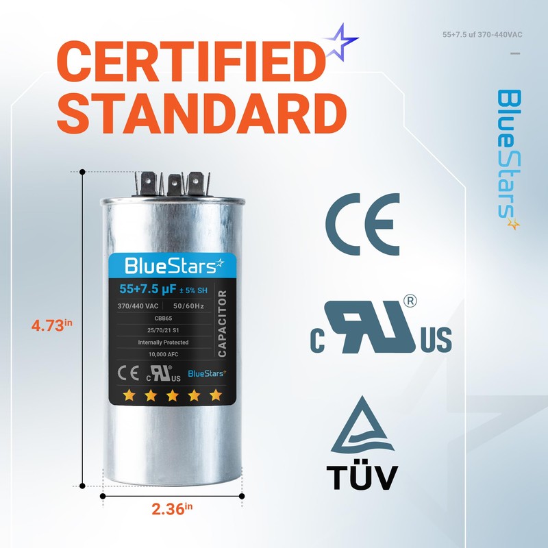 - 🔎 PREMIUM QUALITY: The 55+7.5 uf Dual Run Round Capacitor is manufactured under the toughest USA standards for AC motor run capacitors including EIA-456-A and IEC 60252-1:2001