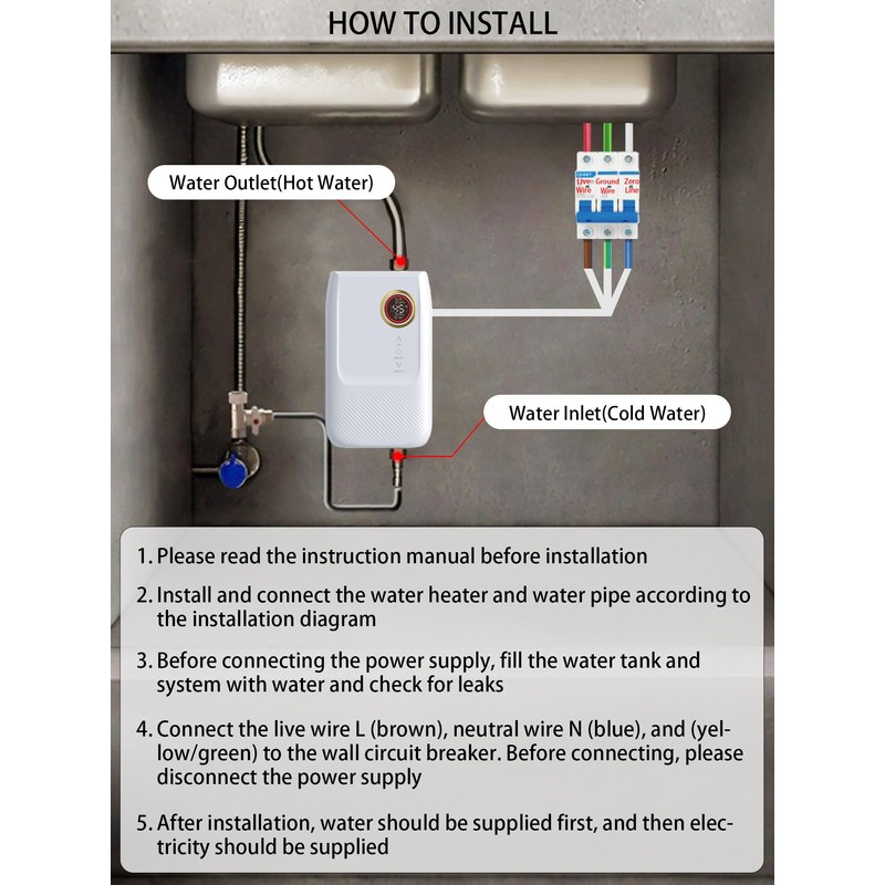 • Specification of Tankless Water Heater: 5500W at 220V requires 4mm ² copper core wire, air switch requirement ≥ 32A, attached wire gauge 10AWG, thread G1/2