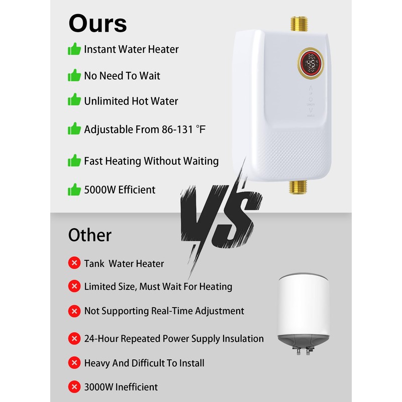• High Quality Materials: 304 stainless steel lining, 316L stainless steel heating tube, sturdy ABS shell, corrosion-resistant brass interface G1/2