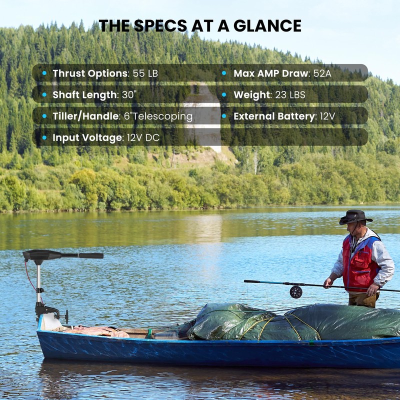 - 55Lb Thrust & Quiet Operation: This trolling motor provides 55 lbs of thrust (approx. 0.48 HP - 0.83 HP), enabling smooth, efficient navigation across conditions. Suitable as a boat outboard motor or kayak motor, it operates with minimal noise. Designed to help reduce overheating during extended fishing, cruising, or exploring trips
