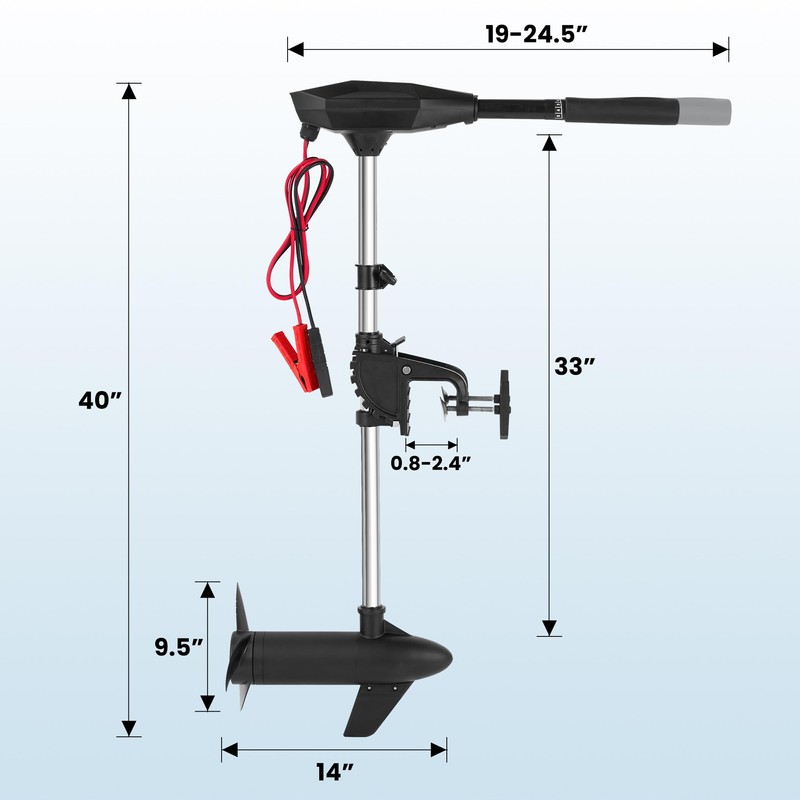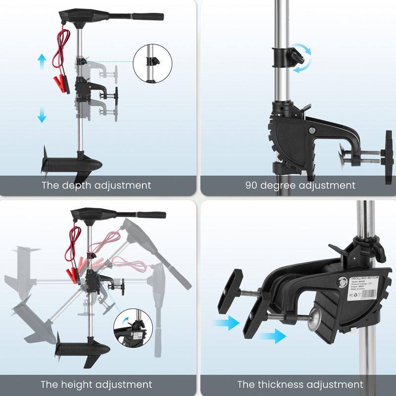 - 30-Inch Adjustable Shaft: Designed for versatility, this trolling motor features a 30-inch adjustable shaft for depth placement in shallow or deeper waters. The three-blade propeller enhances propulsion efficiency, reducing drag while delivering steady power for smooth operation. This aerodynamically balanced kayak motor or boat motor design helps minimize water resistance, contributing to a stable ride for kayaks and small fishing boats in freshwater