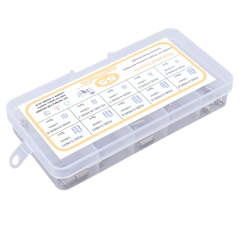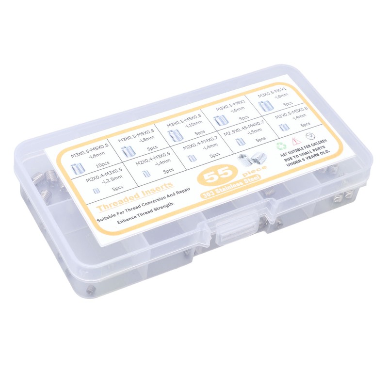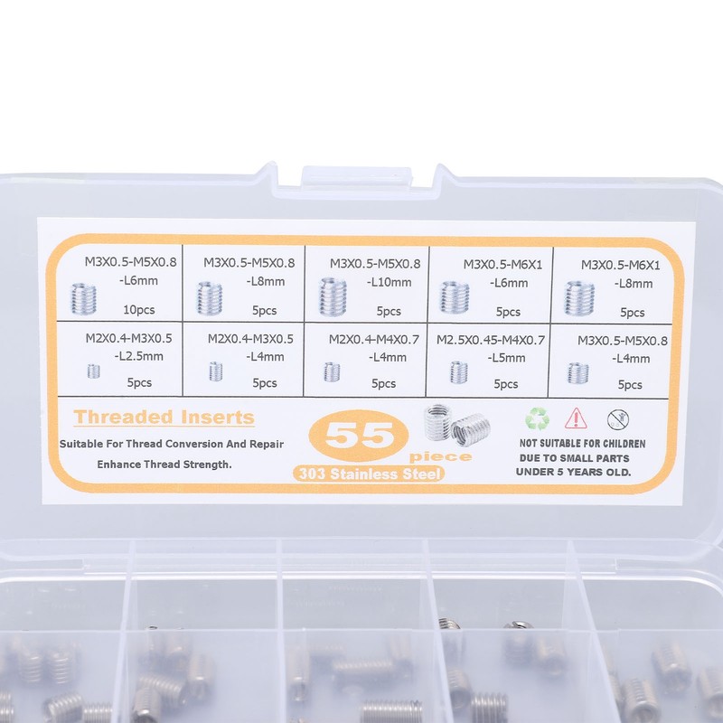 1、Thread Repair: This insert nut is a great repair tool when it comes to threading errors or repairing damaged female holes. 2、Reliable Work: Works perfectly with screws and bolts, the threaded nut ensures firm fixing without slipping, very reliable. 3、Include 55Pcs: There are 55pcs insert nut in different sizes, and the large quantity will satisfy your varied working needs. 4、Broad Utility: Suits for aviation, automobile, electronic communication, computer, lighting, equipment and other fields. 5、Good Material: Made from premium stainless steel material with high hardness, durable with corrosion and long term using.
