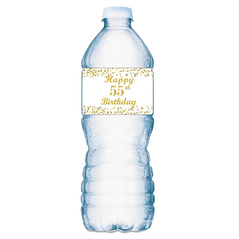 55th Birthday Water Bottle Labels; Set of 20 Waterproof Water Bottle Wrappers;Gold and White. Happy Birthday Labels