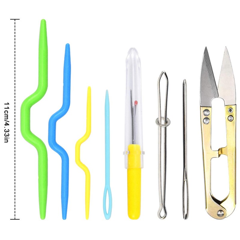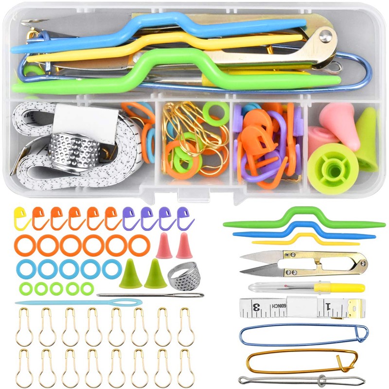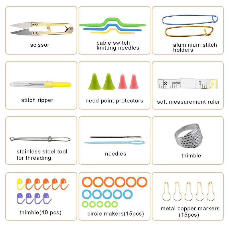 - What do you get? - Scissors, cable knit needles, aluminium stitch holder, stitch ripper, mesh stopper, tape measure, thread clamp, large eye needles, thimble, stitch marker (10 pieces), stitch marker ring (15 pieces), safety pin (10 pieces) and storage box.