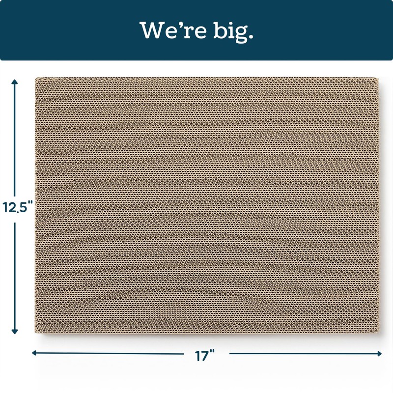 - [GENEROUS SIZE = MAXIMUM ENJOYMENT] Tired of buying cat scratching boards that are too small for your feline roommate? Ours is large, both wider *and* longer. A luxurious retreat for your cat to sleep and scratch. Let them stretch out, curl up, or completely hide away – the choice is theirs. This cat scratcher ensures larger cats can comfortably enjoy their own scratching haven. 17.1”Lx13”W < < compare us!!