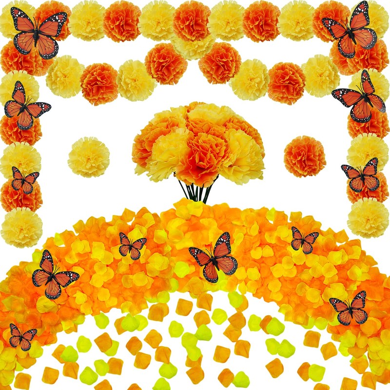 - Package Includes: you will receive 50 pieces of artificial marigold flowers with stems(orange 25pcs,yellow 25pcs),12 pieces of artificial butterfly decorations and 500 pieces of marigold petals(orange 300pcs,yellow 200pcs), the combination is ideal for Day of the Dead and Halloween