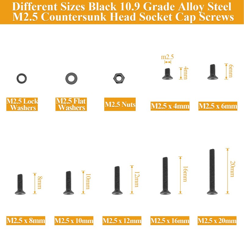 - √ Dimension: Total 565 pieces M2.5 x 4 /6 /8 /10 /12 /16 /20mm black countersunk head socket cap screws with matching nuts, lock washers and flat washers, different sizes and enough quantities can meet your different daily needs.