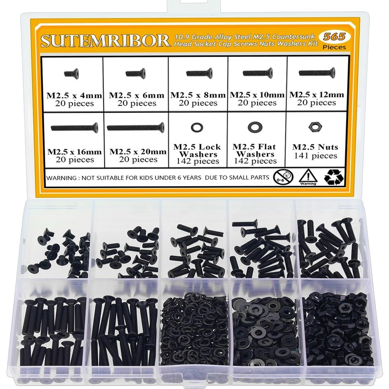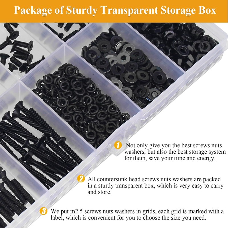 - √ Package Included: 565 pieces Sutemribor M2.5 x 4/6/8/10/12/16/20mm black countersunk head socket cap screws nuts washers are packaged in a clear plastic box, we put screws nuts washers in 10 grids, each size is marked with a clear label, which is very convenient for you to carry and use. If you have any questions, please free to contact with us and we will reply to you as soon as possible.