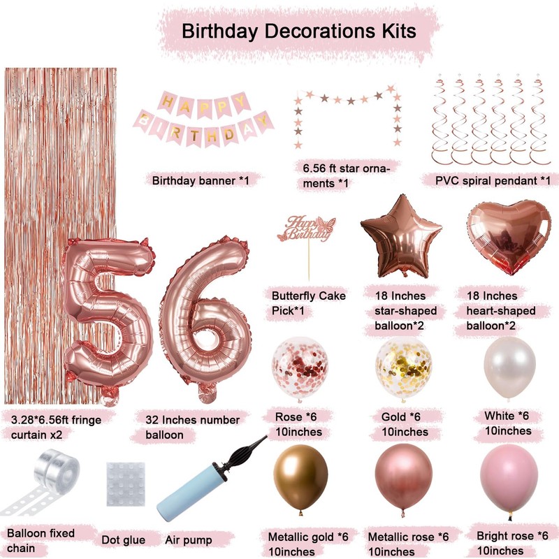 - The best choice for a 56-year-olds girl's women's birthday party: create a balloon arch with beautiful rose gold balloons. Shiny rose gold tassel curtains, 'Happy Birthday' banners, and star mirror tassels are perfect for decorating the walls. Different rose gold decorative elements will make your birthday party unique.