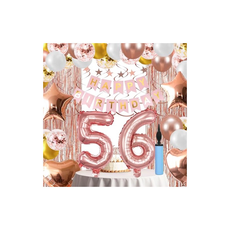 56th Birthday Decorations For Women, Happy Birthday Banners Party Decor Foil Fringe Curtains Heart Star Confetti Balloons, Hanging Swirls Party Supplier Rose Gold