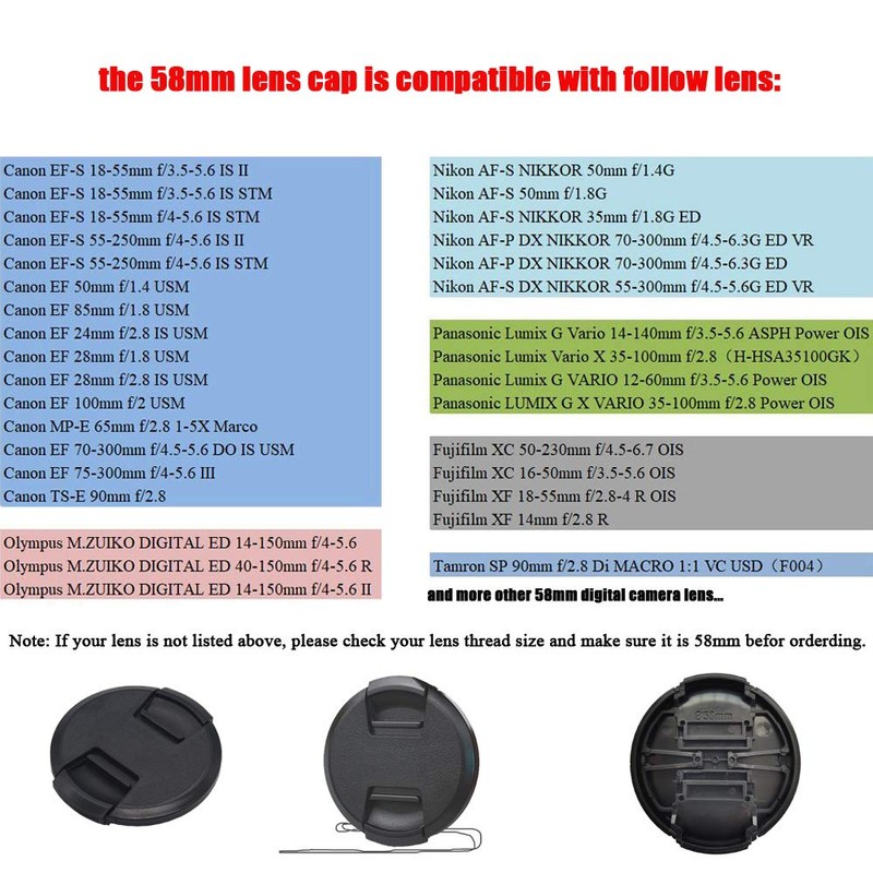 - 【For 250D(Rebel SL3)Rebel T8i(850D)】This 58mm lens cap was designed for Canon Rebel SL3 250D Rebel T8i(850D) camera with EF-S 18-55mm f/3.5-5.6 IS II, EF 50mm f/1.4 USM, EF-S 55-250mm f/4-5.6 IS II, EF-S 18-55mm f/3.5-5.6 IS STM … and other 58mm lens as shown in picture.