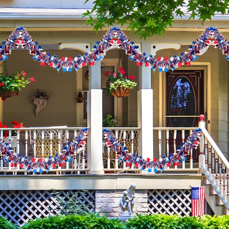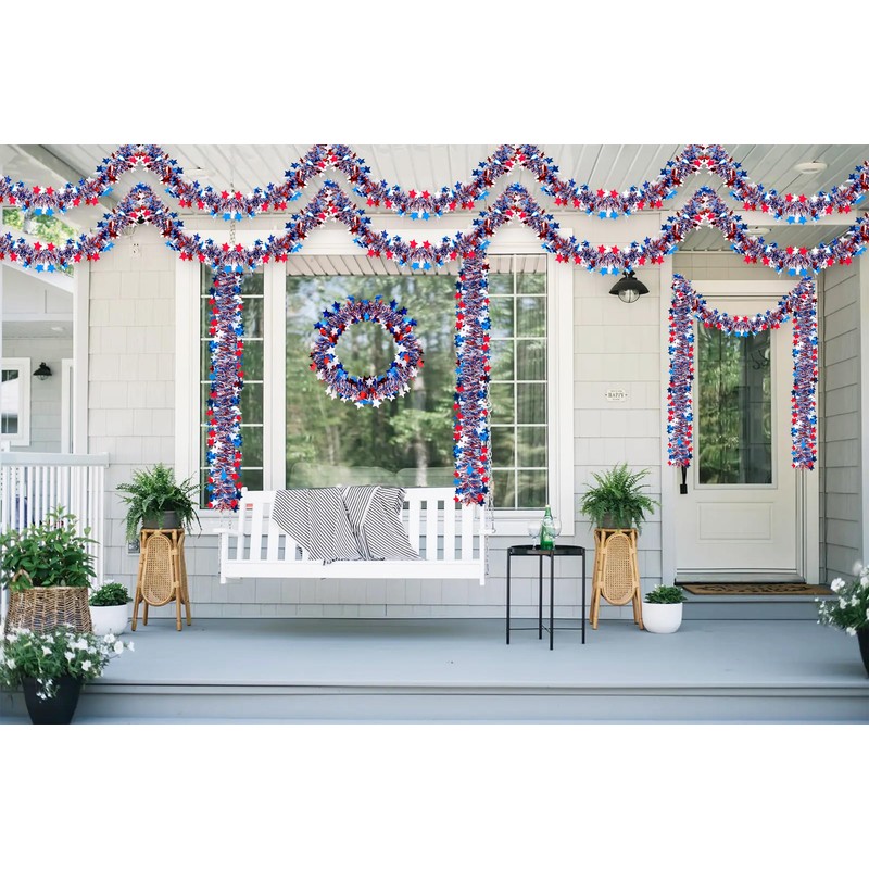 - Easy to install and use: tinsel garlands can be used to easily decorate your home for the 4th of july party; hang them from doorways, windows, hallways, stairs, or even around your front door, porch, wall, fireplace mantle, garden fence, tree, classroom, and more; you can also create your own independence day decorations, such as a wreath