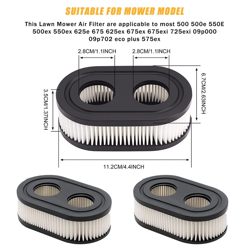 - SUITABLE FOR MOWER MODEL: This Lawn Mower Air Filter are applicable to most 500 500e 550E 500ex 550ex 625e 675 625ex 675ex 675exi 725exi 09p000 09p702 eco plus 575ex series engines with filter paper.