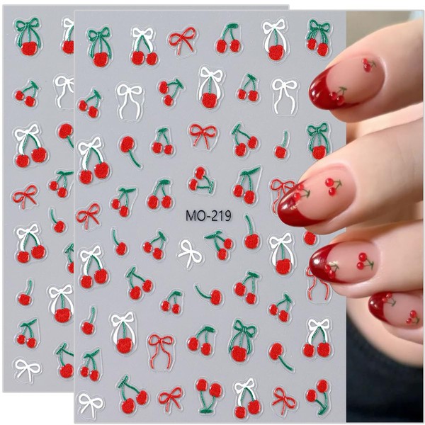 5D Embossed Cherry Nail Stickers Spring Summer Nail Decals Self Adhesive Bow Nail Stickers Red Cherry Design DlY Art DecoratiNail Decals for Woman Girls Art Supplies 2Sheets