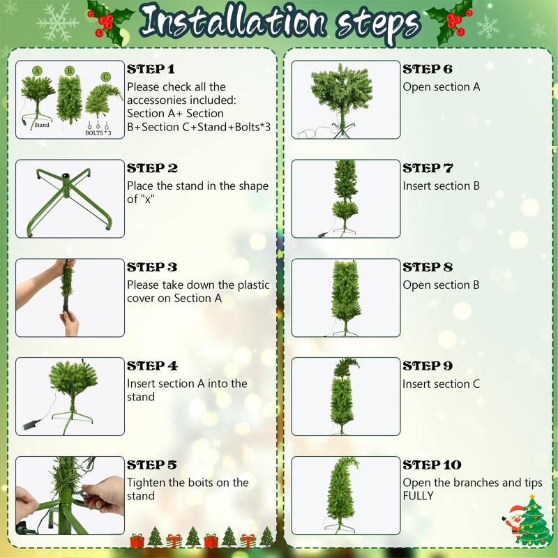 - Easy to Assemble: Our pre lit christmas trees 5ft is easy to assemble, thanks to its three-section structure and intuitive setup process. Simply secure the sturdy metal base to shape X, splice the sections together, fluff the branches to achieve the perfect look, find and connect the top, middle, and bottom plug connectors, making your decorating quick and hassle-free