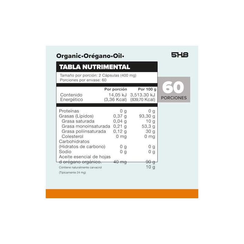 5H8 Nutrition Aceite de Organo 120 caps 100 Natural Adicionado con Aceite de Oliva 25 mg de Carvacrol 60 porciones Suplemento Alimenticio