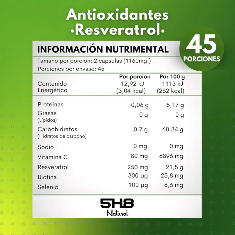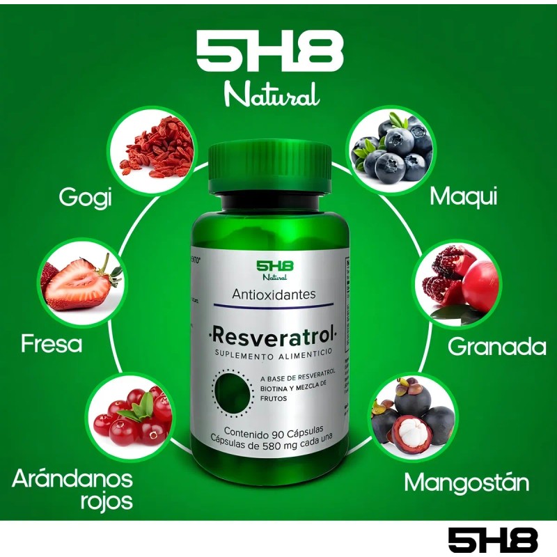 Rejuvenece con 5H8 Resveratrol (250 mg) con Frutos Rojos y Biotina. Estas 90 cápsulas sin sabor ofrecen un potente poder antioxidante y antienvejecimiento. Fortalece tu cabello, piel y uñas, mientras proteges tu cuerpo con los beneficios de arándanos, goji, granada, fresa y mangostán y Vitamina C. ¡Belleza y vitalidad desde el interior!