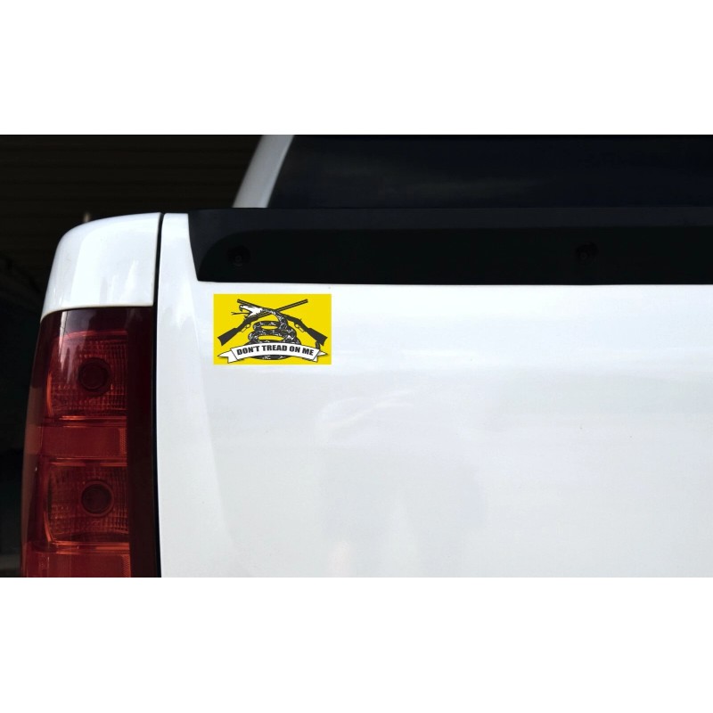 This sticker is 5 inches wide by 3 inches tall when applied. It depicts the Gadsden flag, with crossed guns and a coiled up snake in front of a yellow background and a banner that reads, DONT TREAD ON ME. This quality-made product is a great way to show off your love for history in a unique way!
