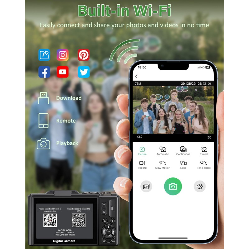 - 【Wireless WiFi Connectivity Camera】 Instantly share photos with built-in WiFi, allowing remote control and fast sharing. Whether at a family celebration or on a trip, stay connected and share your memories in real-time with friends and family