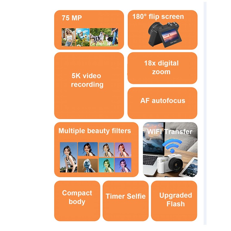 5K Digital Camera for Photography, UHD Autofocus WiFi 75 MP 180° Flip Screen 18X Zoom Compact Point Shoot Vlogging Cameras, HD WiFi Compact Cameras for YouTube Travel (White)