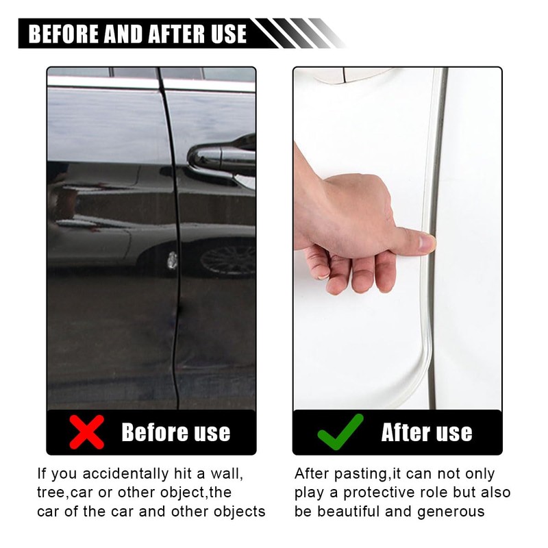 The car door protector can protect the outer car door edge from hitting the walls or other cars, which won't fall off or fade even under heavy rain and car wash.