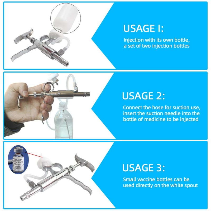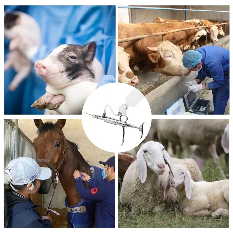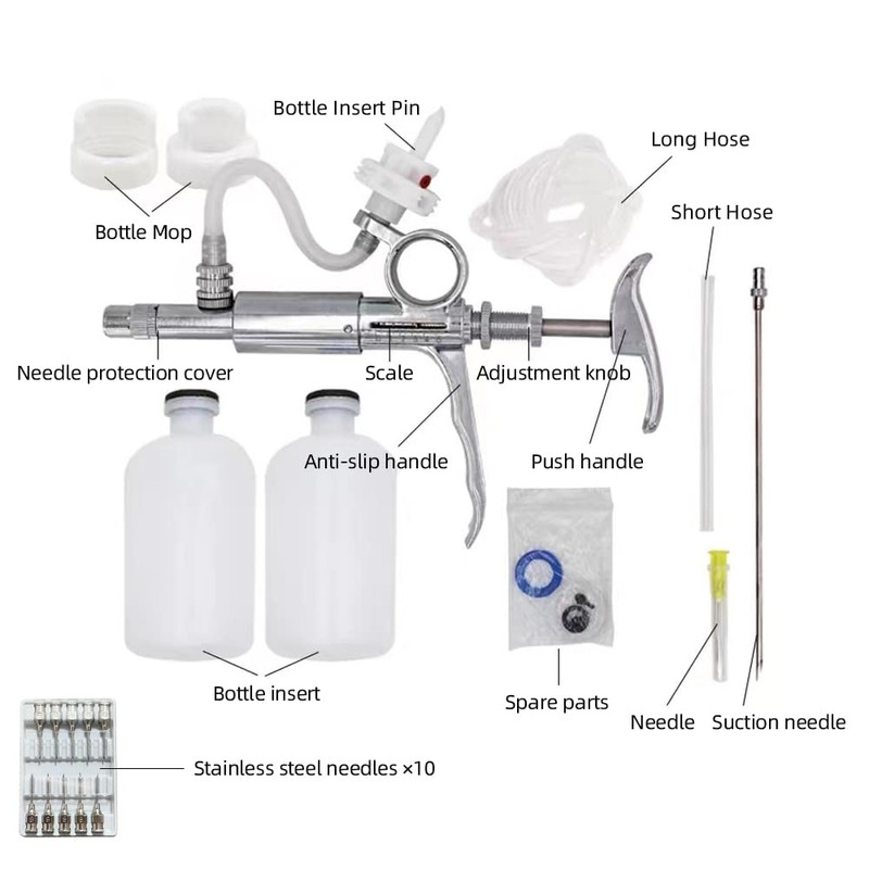 - Product Name: Stainless steel continuous triple-use syringe, the body is made of stainless steel, not easy to rust, durable, especially suitable for high volume and high intensity injection in farms, and can be disassembled for high temperature sterilization.
