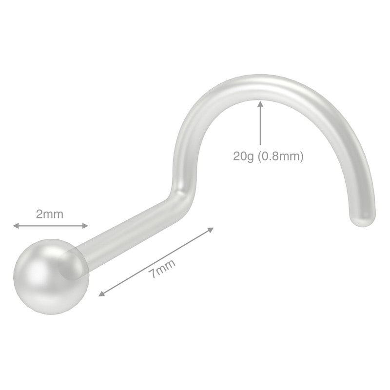 • SPECIFICATIONS - Length: 6mm (1/4). Gauge: 20g - 0.8mm. Color: clear. Ball End: 2mm ball. These 2mm nose screw are designed and tested for quality. Get the most out of your piercing with these screw nose rings 2mm
