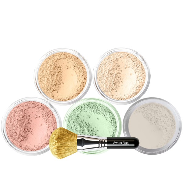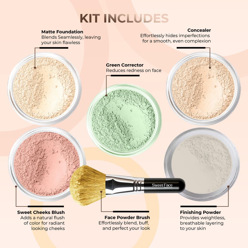 **MINERAL MAKEUP KIT with FACE BRUSH.** Please refer to the Foundation Color Chart for your exact Foundation shade. **Mineral Foundation:** Sweet Face Minerals foundations are all natural and very lightweight. Our products never appear heavy or look caked and are wonderful for every skin type. Will not cause irritated itching skin or acne. **Concealer:** Our concealers will offer more coverage than your regular foundation blend. Concealers are ideal for hiding dark under eye circles, and concealing blemishes, camouflaging imperfections and will help to neutralize the look of splotchy skin **Sweet Cheeks Blush:** A soft and natural earth toned pink color. This shade is very mild and because it's mineral makeup, it has staying power! This color can also double as an eye shadow. Green Corrector: Green correctors are far more effective in covering redness on the skin. ***Side note:** **If you prefer our Yellow Corrector:** Yellow correctors work great at covering dark circles under the eyes and toning down pink skin giving a more natural look. (Only one corrector will come with this kit) Please let us know by leaving us a note at the time of checkout. **Perfection Finishing Powder:** This silky feather-soft powder provides weightless, breathable layering to your skin. Brush it on after your makeup has been applied. It's light and delicate and gives the appearance of perfection! Each jar in this kit is a 20 gram sifter jar filled to capacity with 9 grams of powder. **Flawless Face Powder Brush:** This brush is so handy and compliments this amazing kit. Includes an instruction card for applying your makeup like a pro. Made in the USA Animal Cruelty Free All Natural